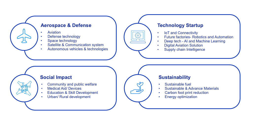 Early – Stage Startups in the domains of Aerospace, Spacetech, E-Mobility, Green Energy, Sustainability & Social Impact.