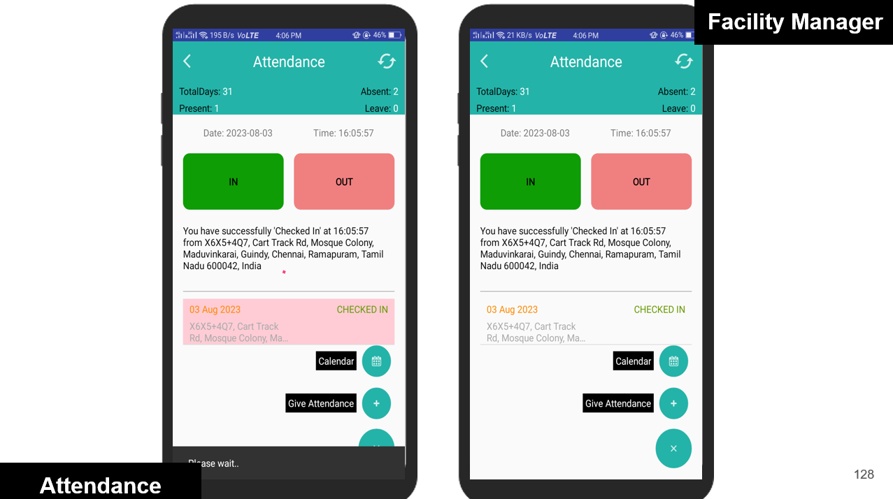 Facility Managers can conveniently mark their attendance by checking in and out directly from the mobile app. Each check-in/out is validated against the predefined geofence to ensure the manager is within the designated work location. If the geofence condition is not met, the system immediately alerts the user with a warning.