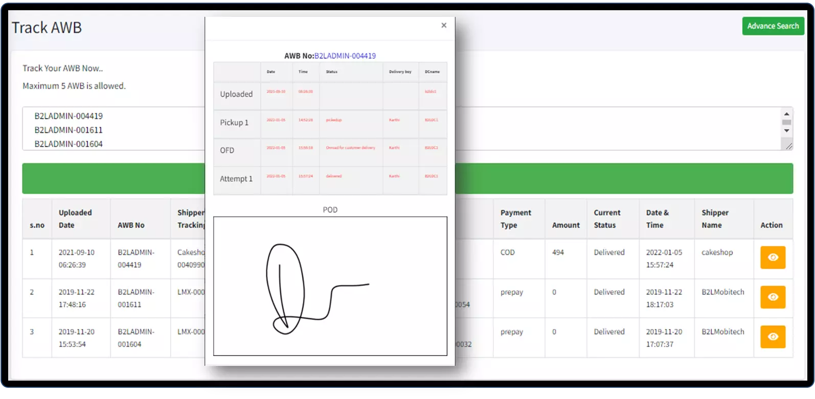 Monitor fleet movement live on a map.Gain real-time visibility of multiple riders, identify route deviations or any other business exceptions and take time-sensitive actions. See active users, current tasks and key metrics like status of the packages,delivered and returned across the entire dataset, or for specific cities or branches. Visualize the movement of the users through the entire day and see actions performed with timestamps.